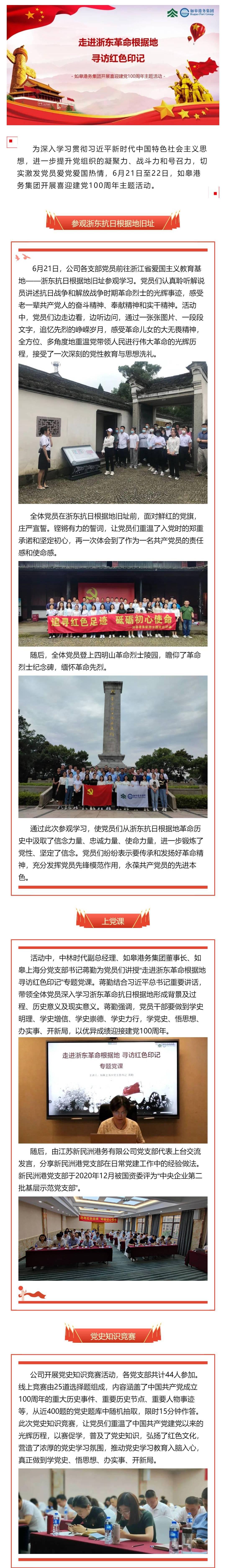 為深入學(xué)習(xí)貫徹習(xí)近平新時代中國特色社會主義思想,進一步提升黨組織的凝聚力、戰(zhàn)斗力和號召力,切實激發(fā)黨員愛黨愛國熱情,6月21日至22日,如皋港務(wù)集團開展喜迎建黨100周年主題活動。